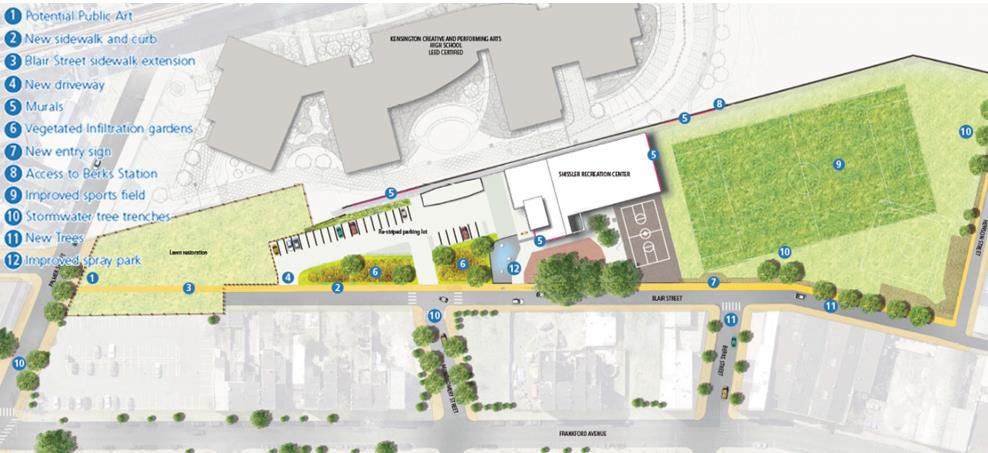 Take a look below to see the before and after pictures of the improvements made to Shissler Recreation Center, as well as the new Kensington High School for the Creative and Performing Arts, spray park, Palmer Doggie Depot dog park, and Stan “The Cutman” Field for kids. Or better yet, visit the Big Green Block! You’ll find it on the block bordered by Front Street, Frankford Avenue, Palmer Street, and Norris Street.