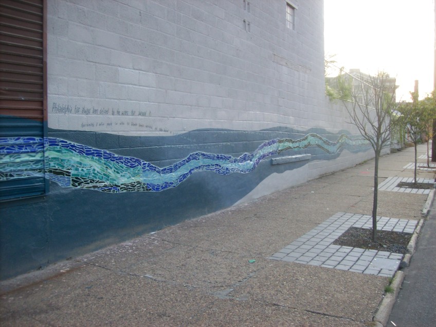 Informative and attractive murals about stormwater, which line to the walk to the Berks subway station along Norris Street and give the façade of Shissler Rec Center a splash of color.